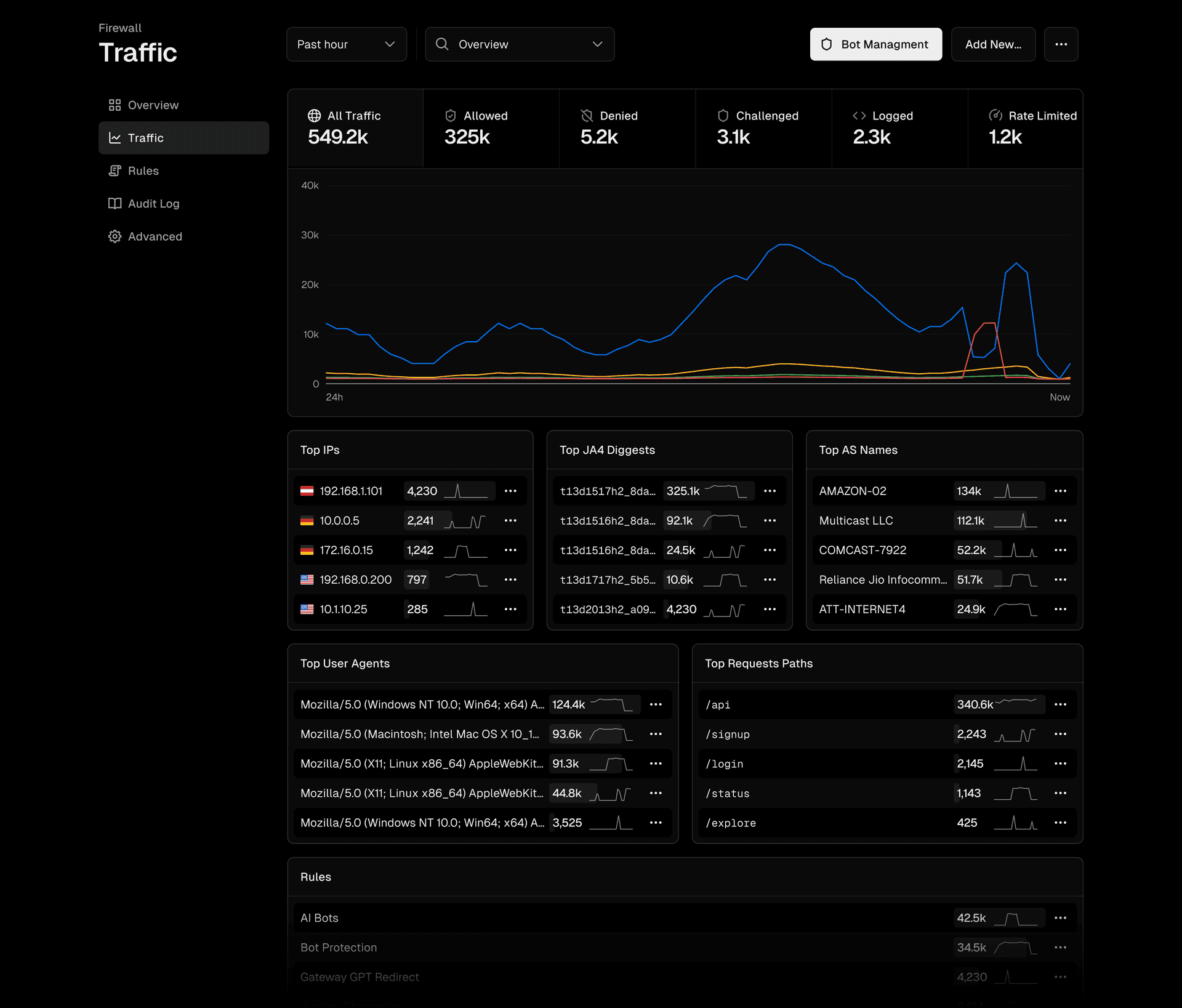 New sidebar navigation offers one click to Overview, Traffic, Rules, and Audit Log