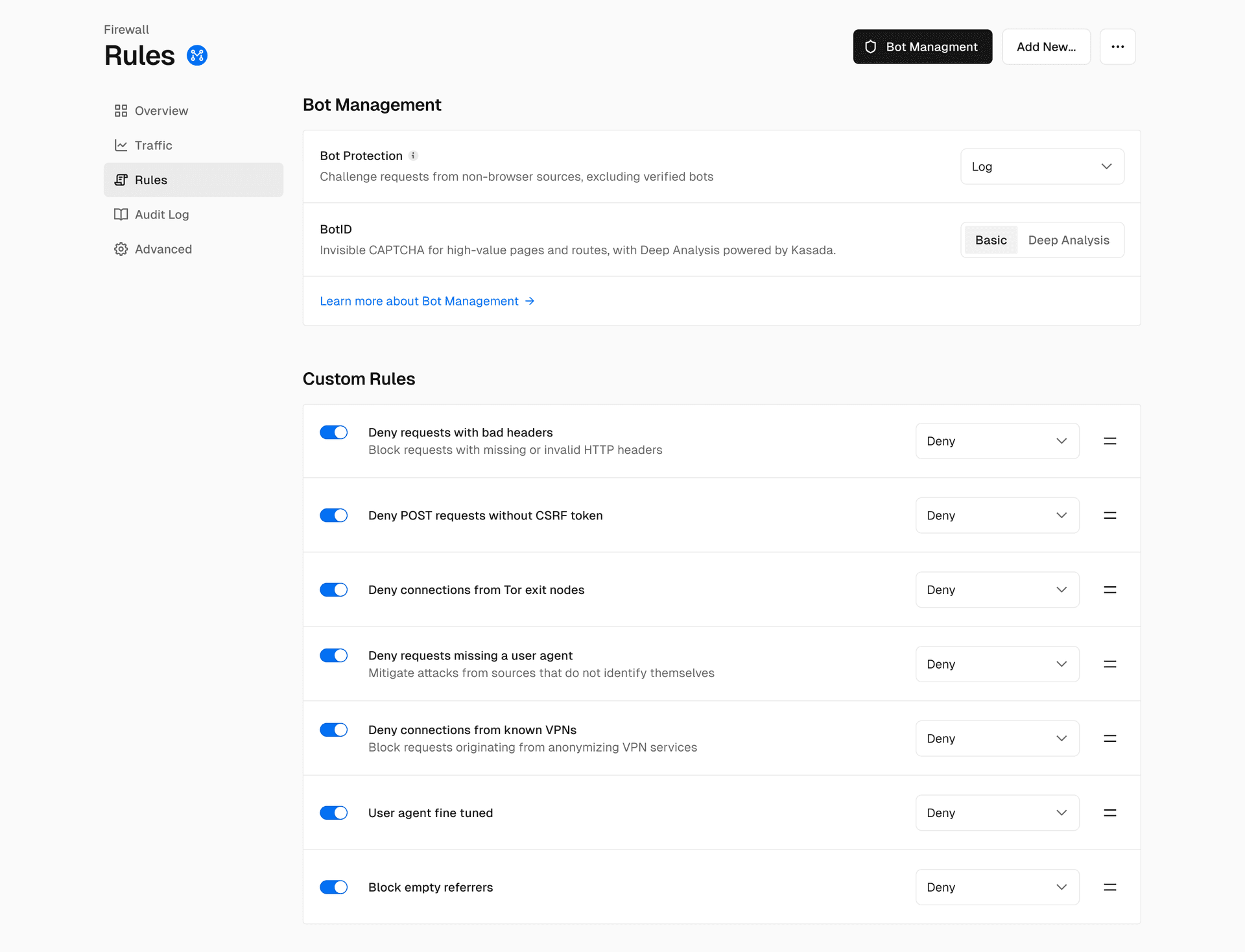 Firewall Rules now have a dedicated tab on the sidebar. You can see and manage all of your WAF custom rules in this view, including Bot Protection, Managed Rulesets, IP Blocking, and more. We’ve also moved the Audit Log to a dedicated tab for full visibility into Firewall changes.