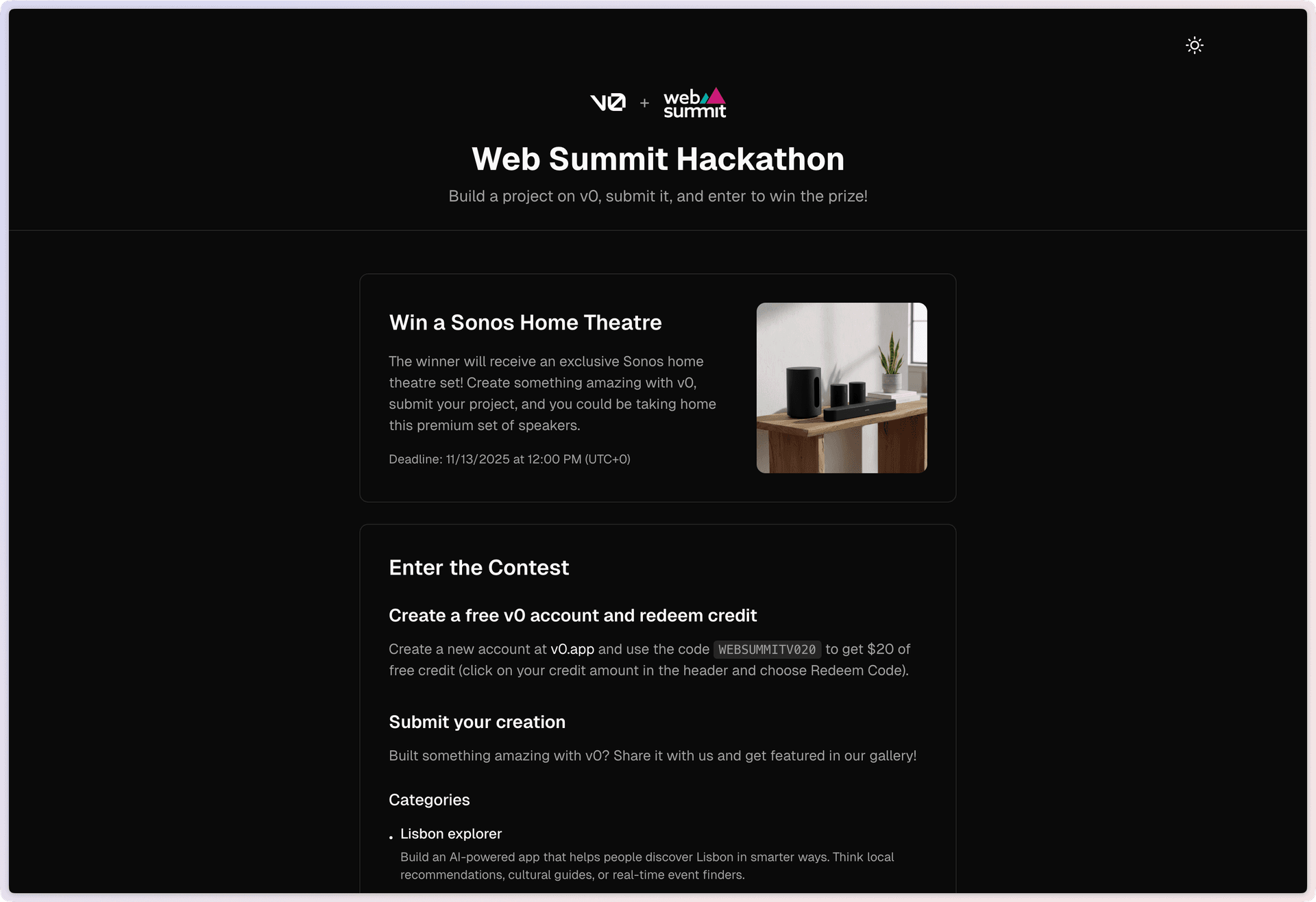 Custom event marketing pages: Our marketing team runs hackathons and other activations at events. We built a v0 template that can be replicated and customized for each event, including a backend for approving hackathon submissions. Our marketing team can replicate the template and customize it for any event without design or development help.