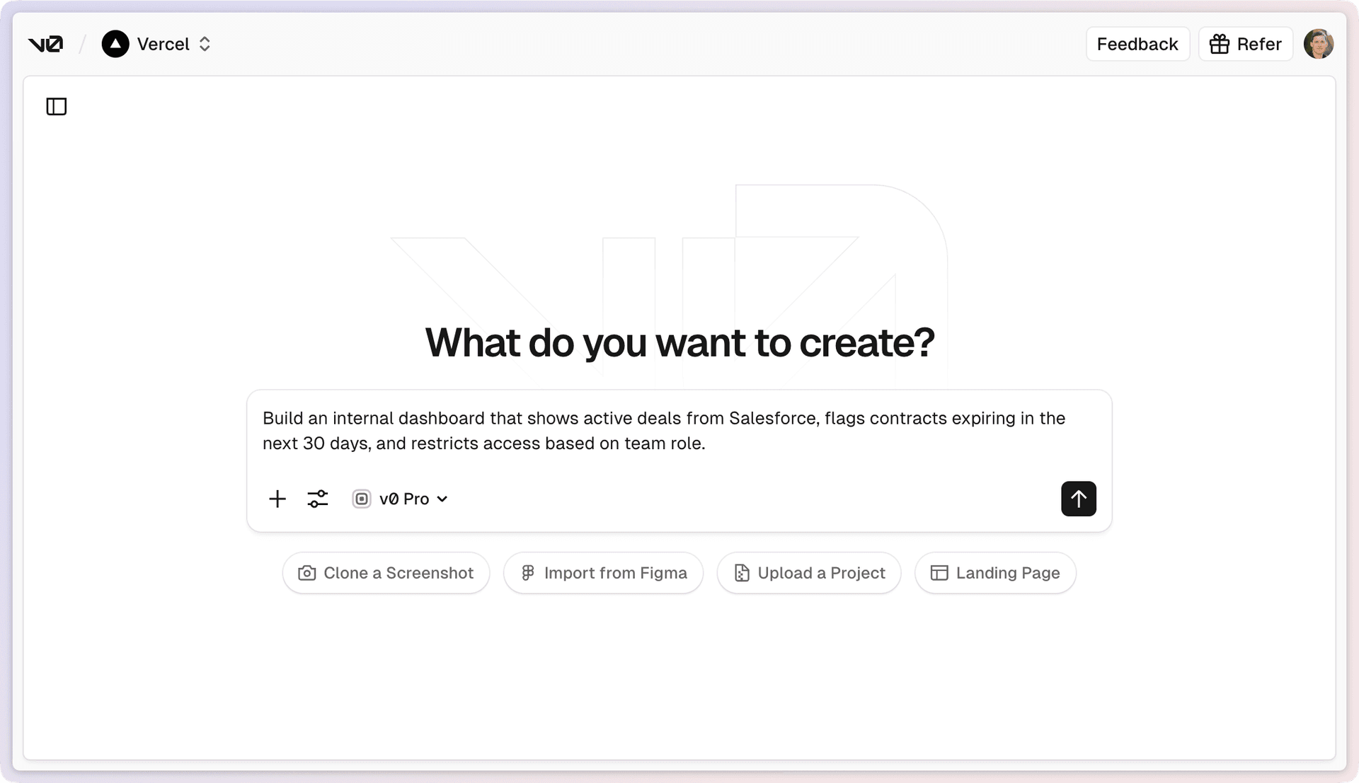 • v0 provides built-in access to common internal and external systems, from databases and warehouses to SaaS tools and internal APIs. Builders describe what data they need and how it should be used, without having to design or maintain the integration layer themselves.