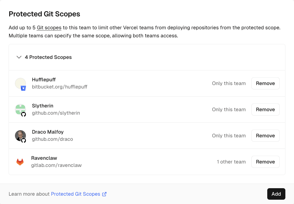 Teams often need control over who can deploy their repositories to which teams or accounts. For example, a user on your team may accidentally try to deploy your project on their personal Vercel Account. To control this, you can add a Protected Git Scope.