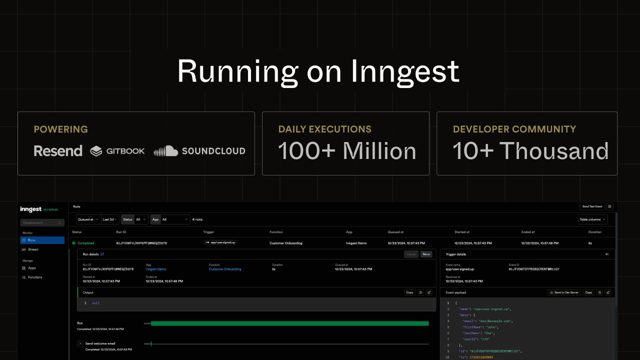 Whether you're building AI workflows, background jobs, or feature-specific workflows (e.g., email campaigns), Inngest has you covered with its low-latency workflow engine, which handles over 100 million daily executions.