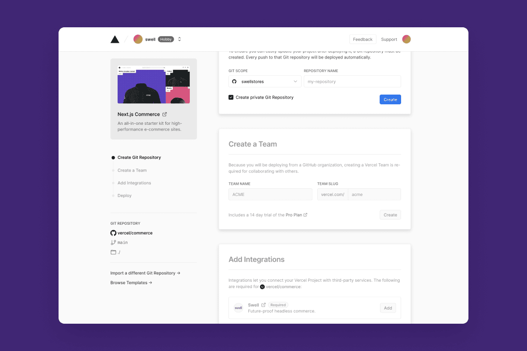 This integration seamlessly integrates your Next.js Commerce project and Swell store to take advantage of Vercel’s performance-driven features like Analytics, Incremental Static Regeneration, and Image Optimization.