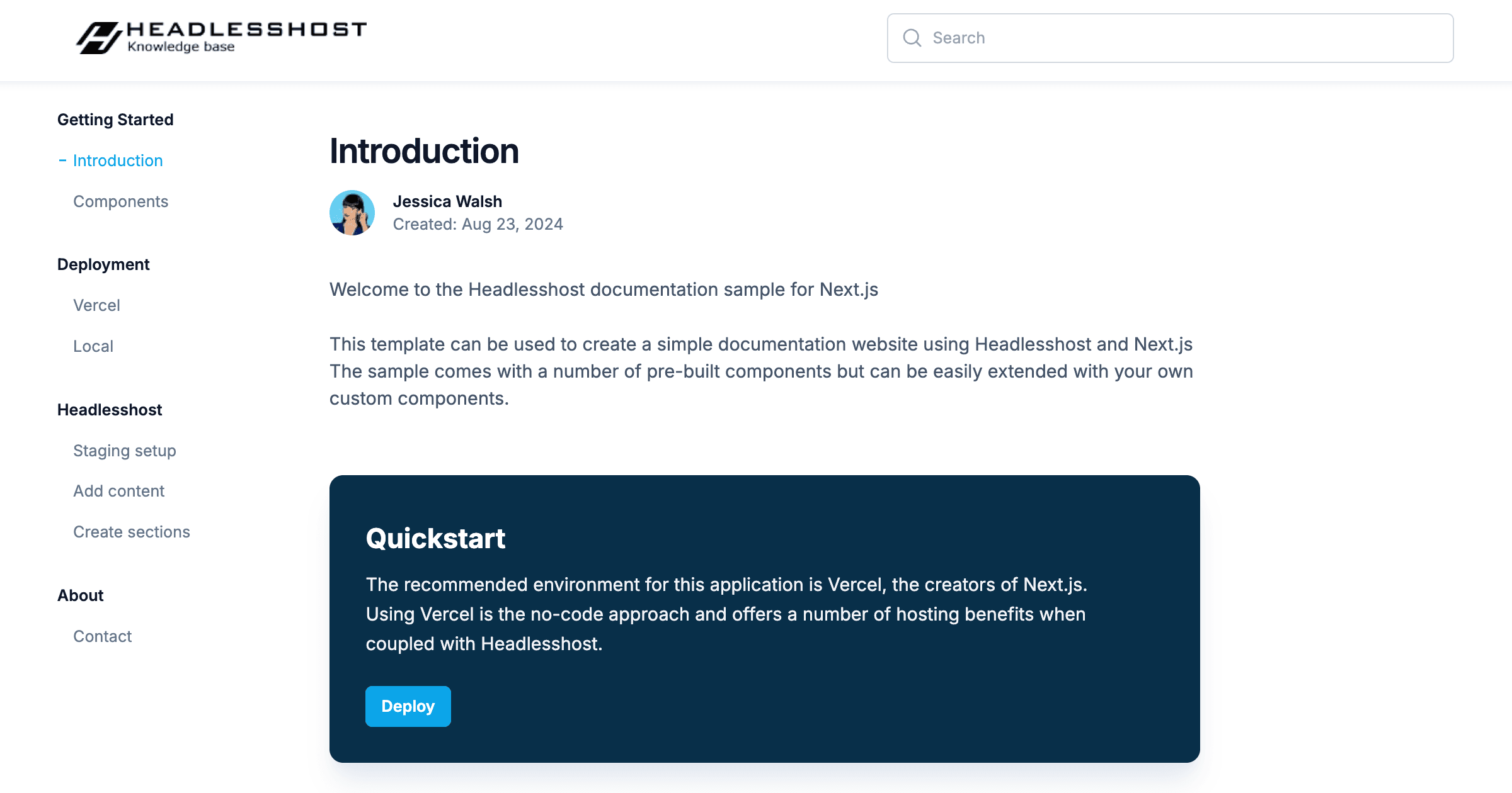This template can be used to create a simple documentation website using Headlesshost and Next.js The sample comes with a number of pre-built components but can be easily extended with your own custom designs.