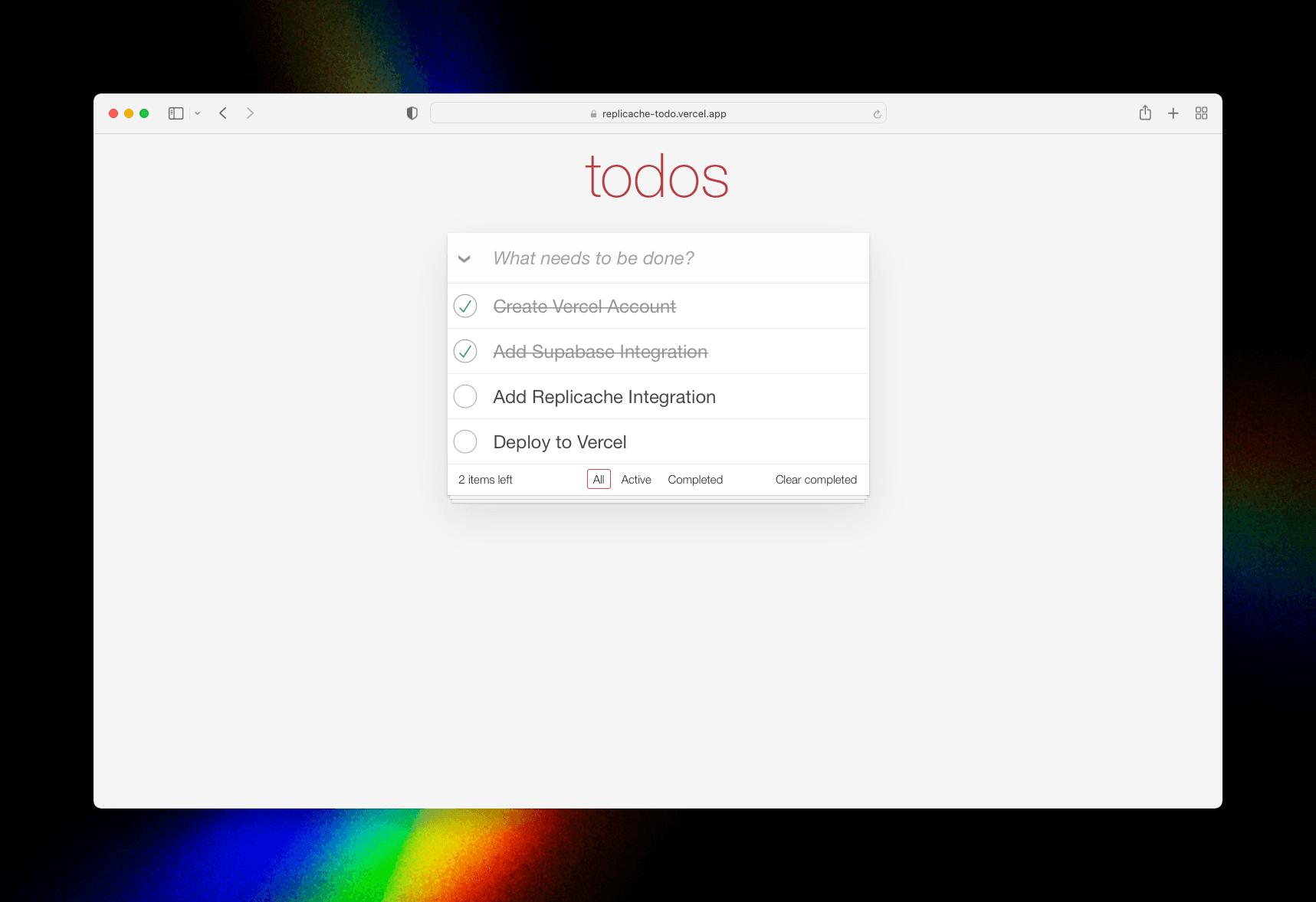 This template creates a full Replicache-powered todo list powered by Vercel, Next.js, and Supabase. You can use this as the basis for your own Replicache powered app.